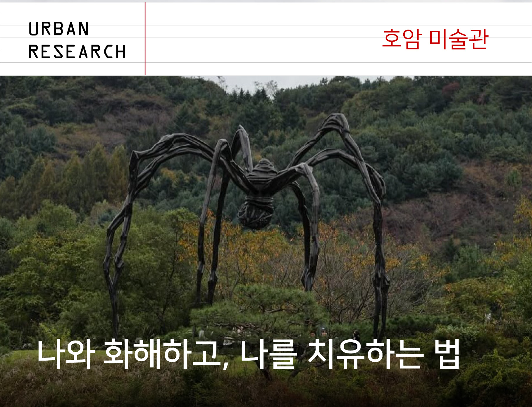 나와 화해하고, 나를 치유하는 법 청동 거미를 엄마로 표현한 작가가 있어요. 프랑스 출신의 루이스 부르주아(1911-2010) 는 엄마라는 뜻의 거대한 설치작품인 '마망'(Maman) 시리즈를 만든 작가예요. 그녀가 만든 거미들은 가는 다리가 위태로우면서도 강인해 보이죠. 루이즈 부르주아의 전시가 용인의 호암미술관에서 열리고 있어요. 미술관의 넓은 정원과 호수를 배경으로 서 있는 거미는 초현실적인 느낌이에요. 삼성그룹 창업자, 호암 이병철 선생이 만든 ‘호암미술관’은 한옥 형태의 외관과 한국식 정원의 멋을 느낄 수 있는 곳이에요. 미술관 가는 길은 ‘희원’이라 불리는 정원을 통과하는데요, 아담한 연못과 정자, 숲길까지 모두 작품이에요. 자연의 경치를 빌려온다는 의미의 ‘차경’ 개념으로 조성된 정원은 마치 풍경화 속으로 들어온 듯하죠. 내년 1월까지 열리는 <루이스 부르주아: 덧없고 영원한>는 트라우마, 가족관계, 무의식 등의 테마로 110여 점이 전시되어 있어요. 아버지의 반복된 외도와 불안한 가족관계, 심리적 긴장은 그녀의 작품에서 반복적으로 나타나고 있어요. 기하학적인 토템, 강렬한 붉은색 작품들, 아버지의 파괴를 암시하는 설치 작품 등은 작가의 아픈 내면을 들여다보는 듯해요. 부르주아는 끊임없이 과거와 대면하는 고통을 느끼면서도 감정을 해소하고 있어요. 루이스 부르주아는 이렇게 말하죠. ”누군가가 예술가라면, 이는 그가 온전한 정신을 가졌다는 증표다. 그는 자신의 고통을 견뎌 낼 수 있다.” 그가 얼마나 예술을 통해 자신과 화해하고 자신을 치유하려고 했는지 알 수 있어요. 루이스 부르주아는 70세 이후에 평단의 주목을 받았어요. 페미니즘과 트라우마와 같은 개인 서사가 예술계의 이슈로 떠오르는 1970-80년대를 거치며 1982년 뉴욕의 MoMA 미술관에서 회고전을 계기로 정점을 찍었죠. 노년에 주목을 받음으로써 그녀의 삶이 통째로 하나의 거대한 작품처럼 보이게 했다고 할까요? 우리는 평생 자기 자신과 함께 살아야 하죠. 그러니 나 자신을 더 잘 이해하고 보듬는 방법을 찾아보기로 해요. 그렇게 우리는 자신을 치유할 수 있는 예술가가 될 수 있지 않을까요? Bronze spiders have been used to symbolize “mother” by a certain artist. Louise Bourgeois, the French-born sculptor, is known for creating the monumental installation series Maman, a word that means “mom.” Her spiders, with their thin, fragile-looking legs, appear both precarious and powerful at the same time.Currently, an exhibition of Louise Bourgeois is being held at the Ho-Am Art Museum in Yongin. Against the museum’s expansive garden and lake, the towering spider radiates an almost surreal presence. Founded by Lee Byung-chul, the founder of the Samsung Group, the Ho-Am Art Museum is a place where visitors can feel the beauty of traditional Korean architecture and landscape. The path to the museum leads through Heewon Garden, a meticulously designed space featuring a small pond, a pavilion, and a wooded trail — all works of art in themselves. Created with the concept of borrowed scenery, the garden makes you feel as if you’ve stepped directly into a classical landscape painting. Running until January next year, Louise Bourgeois: Impermanent but Eternal presents over 110 works exploring themes such as trauma, family relationships, and the unconscious. Her father’s repeated infidelity, the tension within her family, and her psychological unease appear again and again throughout her work. Geometric totems, vividly red sculptures, and installations hinting at destruction all seem to offer a glimpse into the artist’s wounded inner world. Bourgeois confronted her past relentlessly, yet she used art as a way to release her emotions. Louise Bourgeois once said, “If you are an artist, it is a guarantee that you have a healthy soul. You can survive your own difficulties.” Her words reveal how deeply she sought to reconcile with herself and heal through her art. Interestingly, Bourgeois only gained significant critical attention after the age of 70. As personal narratives such as feminism and trauma emerged as major topics in the art world during the 1970s and 1980s, her 1982 retrospective at MoMA in New York became a turning point. Being recognized later in life made her entire life feel almost like one immense artwork. We spend our whole lives living with ourselves. So perhaps it’s worth learning how to understand and embrace ourselves more gently. In doing so, maybe each of us can become an artist capable of healing our own wounds. 도시의 맥락 읽기,마블로켓 어반 리서치 카카오톡 친구추가로 매주 목요일 노트를 받아보세요!https://pf.kakao.com/_xfQxbpxj/friend 레퍼런스&이미지 출처:MARBLEROCKET