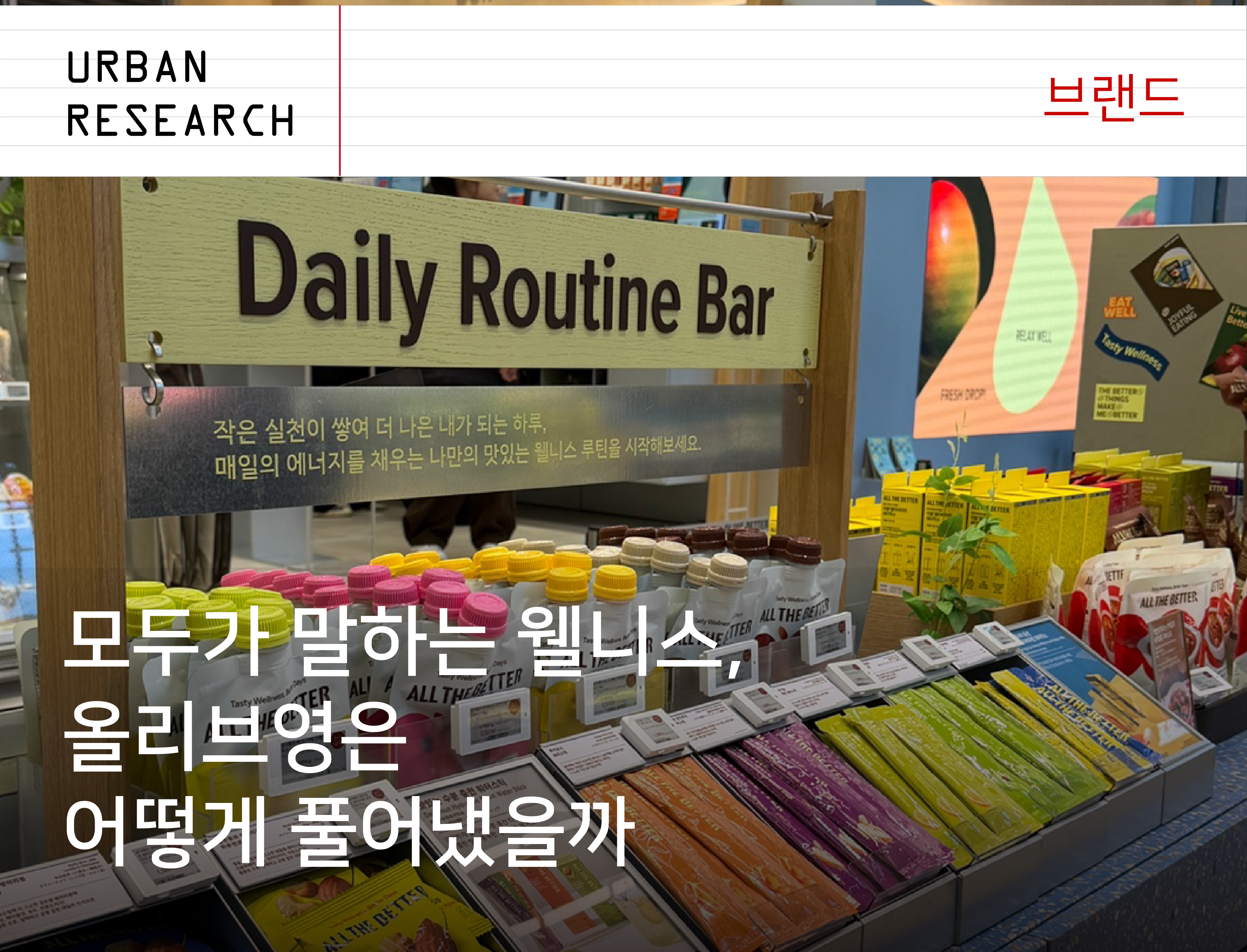 모두가 말하는 웰니스, 올리브영은 어떻게 풀어냈을까 요즘 ‘웰니스’라는 단어를 자주 듣게 되죠. 웰빙(Well-being)과 헬스케어가 결합된 개념이지만, 정확한 뜻을 몰라도 어떤 의미인지 느낌이 와요. 적극적으로 건강을 관리하고, 균형적인 생활 습관을 추구하는 모든 것이 웰니스에 포함된다고 할 수 있으니까요. 이 낯설었던 개념이 어떻게 일상 언어가 되었을까요? 왜 사람들은 웰니스에 빠져들게 된 걸까요? 사실 하루아침에 생긴 흐름은 아니에요. 최근 몇 년 사이 ‘저속노화’라는 키워드가 전 세계적으로 화제가 되었죠. 마트에는 저당 제품이 넘쳐나고, 마라톤 대회는 접수 시작과 동시에 마감되기 일쑤에요. 요가와 명상처럼 마음을 돌보는 활동도 꾸준히 인기를 얻고 있고요. 몸과 마음을 함께 관리하려는 흐름이 자연스럽게 웰니스라는 단어로 모인 셈이죠. 이 거대한 웰니스 흐름의 한가운데에 올리브영이 있어요. ‘올리브베러'(OLIVE BETTER)라는 브랜드를 론칭하며 웰니스 시장을 적극적으로 이야기하기 시작했죠. 지난 1월, 광화문 D타워에 문을 연 올리브베러 매장에 다녀왔어요. 사진출처: 올리브베러 사진출처: 올리브베러 올리브베러는 단순한 매장이 아니라 ‘웰니스 큐레이팅 플랫폼’이에요. 기존 올리브영이 뷰티 중심이었다면, 이곳은 ‘이너 뷰티’에 조금 더 집중한 공간이죠. 잘 쉬고, 잘 먹고, 잘 채우고, 잘 움직이고, 잘 가꾸고, 잘 케어하기. 여섯 가지 ‘WELL’을 중심으로 웰니스 라이프를 제안하고 있어요. 1층은 웰니스를 가볍게 경험해볼 수 있는 공간이에요. 광화문 직장인의 라이프스타일을 반영한 간편한 푸드와 올리브베러가 선정한 ‘주목할 만한 웰니스 상품’, 그리고 입문자를 위한 소포장 제품들이 진열되어 있죠. 웰니스라는 다소 거창한 개념을 부담 없이 경험해보도록 만든 구성이에요. 2층으로 올라가면 분위기가 조금 달라져요. 수많은 제품이 ‘웰니스’라는 하나의 깃발 아래 모여 있죠. 영양제는 물론이고 식단 관리를 위한 오일, 단백질 간식, 디카페인 티, 수면을 돕는 건강기능식품, 심지어 잠옷까지. 건강한 생활을 돕는 거의 모든 것이 웰니스라는 범주 안에 들어와 있어요. 2층 규모의 매장에는 약 500여 개 브랜드, 3,000종 이상의 제품이 준비되어 있어요. 하나하나 살펴보다 보면 시간 가는 줄 모르게 되죠. 보고 있으면 건강에 대한 관심이 자연스럽게 올라가고, 어느새 ‘이건 나에게 꼭 필요하겠다’는 생각이 들기도 해요. 매장 곳곳에는 웰니스에 관한 정보를 적어둔 긴 메모지가 걸려 있는데, 한 장씩 가져갈 수 있도록 해둔 것도 흥미로운 장치였어요. 올리브베러의 장점은 단순히 제품을 많이 모아둔 것이 아니라 큐레이션을 통해 새로운 생활 습관을 제안한다는 점이에요. 글루텐 프리 식재료, 알코올 프리 음료, 로우 슈거, 로우 칼로리 제품처럼 세분화된 제안도 눈에 띄고요. 아침에 일어나 잠들기 전까지, 일상의 흐름 속에서 웰니스를 경험할 수 있도록 구성되어 있어요. 다만 한 가지 생각해볼 지점도 있어요. 건강을 적극적으로 챙기는 것은 분명 좋은 일이지만, ‘진짜 웰니스’가 무엇인지 한 번쯤 되돌아볼 필요도 있죠. 트렌드라는 이유로, 혹은 손쉽게 건강을 챙길 수 있다는 기대만으로 선택하는 것은 어쩌면 웰니스와는 조금 거리가 있을지도 몰라요. 결국 중요한 것은 나에게 맞는 균형이에요. 더 건강해지고, 더 행복해지고, 더 지속 가능한 삶을 살기 위해서는 무엇이 필요한지 스스로 판단하는 능력이 먼저겠죠. 그 기준이 생겼을 때, 올리브베러는 일상 속 작은 습관을 시작하기에 꽤 괜찮은 제안을 하는 공간으로 느껴질 거예요. Everyone Is Talking About Wellness — How Olive Young Interprets the Trend These days, the word “wellness” comes up everywhere. It’s a combination of well-being and healthcare, but even if you don’t know the exact definition, you can sense what it means. Actively managing your health and pursuing a balanced lifestyle — all of that falls under the idea of wellness. So how did this once unfamiliar concept become part of everyday language? And why have people become so drawn to it? In fact, this trend didn’t appear overnight. Over the past few years, the idea of “slow aging” has become a global buzzword. Supermarkets are now filled with low-sugar products, and marathon races sell out almost instantly when registration opens. Activities that care for mental well-being — such as yoga and meditation — are also steadily gaining popularity. In other words, the growing desire to care for both body and mind has naturally gathered under the umbrella of “wellness.” At the center of this powerful wellness wave is Olive Young. By launching a new brand called OLIVE BETTER, the company has begun to actively position itself in the wellness market. I recently visited the Olive Better store that opened last January in D-Tower, Gwanghwamun. Olive Better is not just a retail store; it presents itself as a “wellness curation platform.” While traditional Olive Young stores focus mainly on beauty products, this space puts greater emphasis on inner beauty. The brand proposes a wellness lifestyle built around six themes of “WELL”: resting well, eating well, nourishing well, moving well, grooming well, and caring well. The first floor is designed as a place where visitors can casually experience wellness. It feature